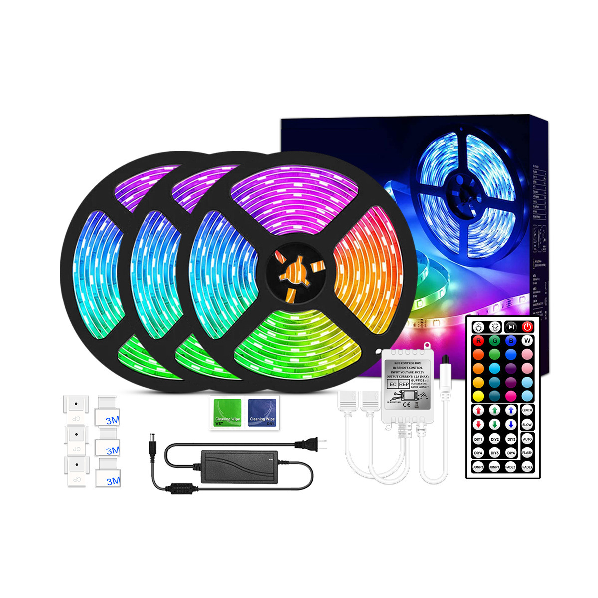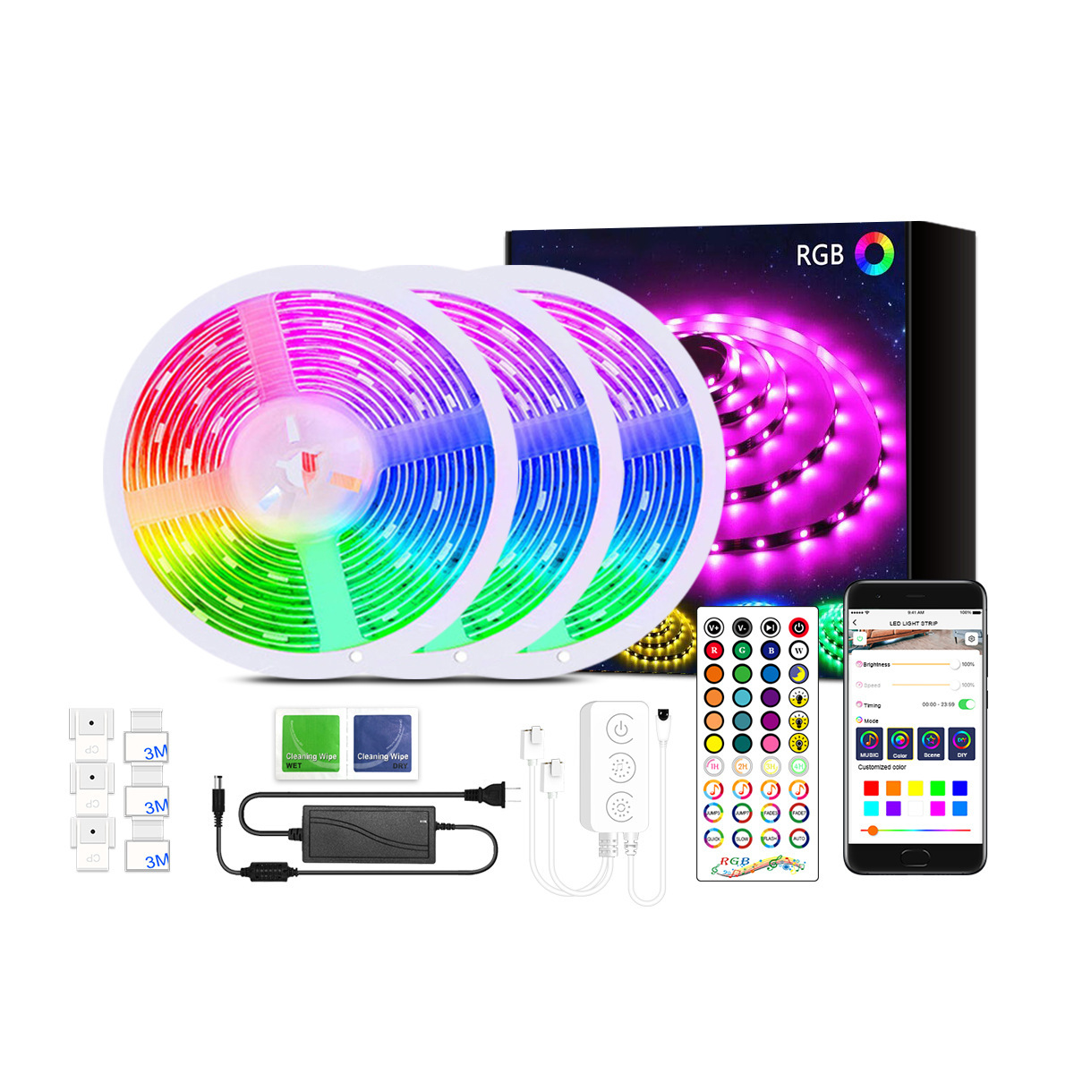 2 styles: 1 roll/5 meters 360 lights + music controller + power supply + remote control + 6 snaps + 6 screws